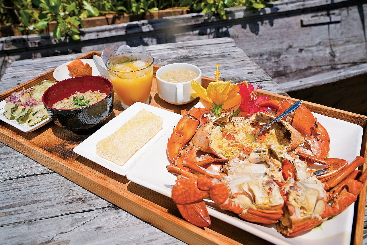 クルーズのハイライトは、マングローブ蟹のゴージャスコース! サバニクルージングにマングローブ蟹(ノコギリガザミ。沖縄ではガサミ)が付いた特大コースは1人14,780円。モンパの葉や、ハイビスカスの天ぷら(写真左端)も◎