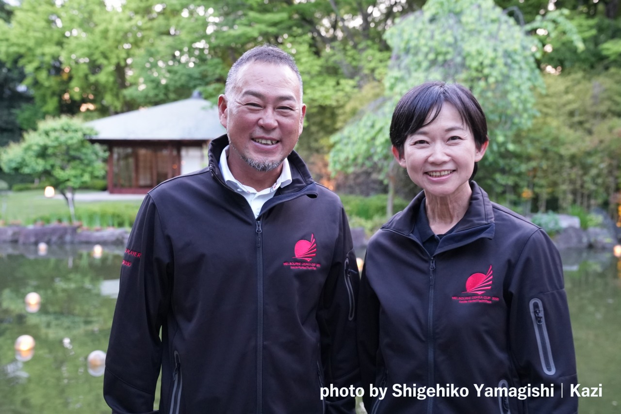 オーストラリアで〈ジャズプレイヤー〉(ベイクウェル・ホワイトZ39)を購入してレースに臨んだ中野佳代子さん(下写真右)。オーナー・スキッパーとして、5,500マイルというオフショアレースを見事に完走。下写真左は共にメルサカに出場したコスキッパーの中西満男さん