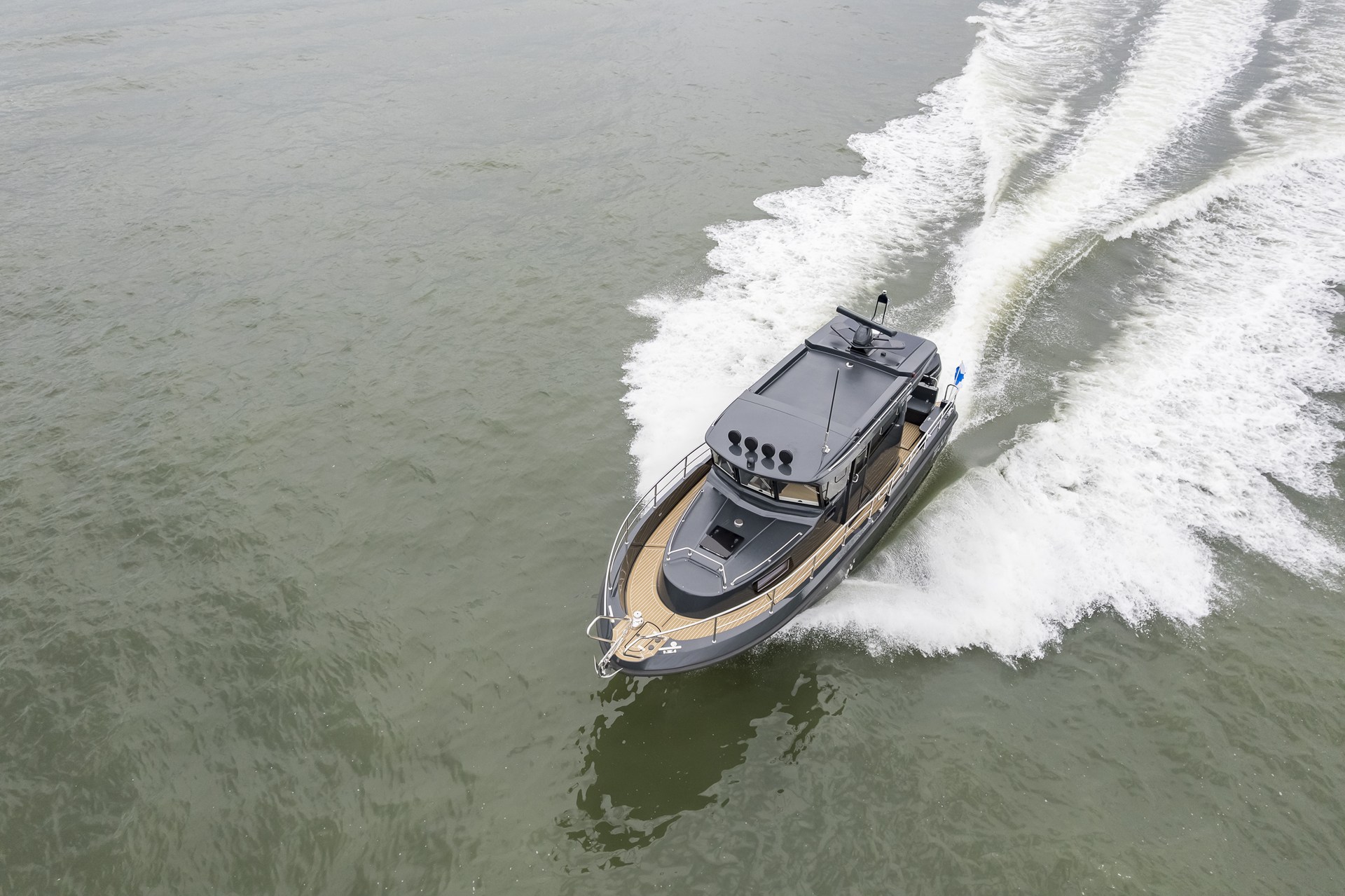 今夏、インプレッション取材を実施したノードスター33+。パイロットハウスを含む船体全体をダークグレー(ブラックにかなり近い)に塗装した特別仕様で、非常に精悍な印象を受ける。特徴的な前傾したフロントウインドーの形状が、よくおわかりいただけるはずだ