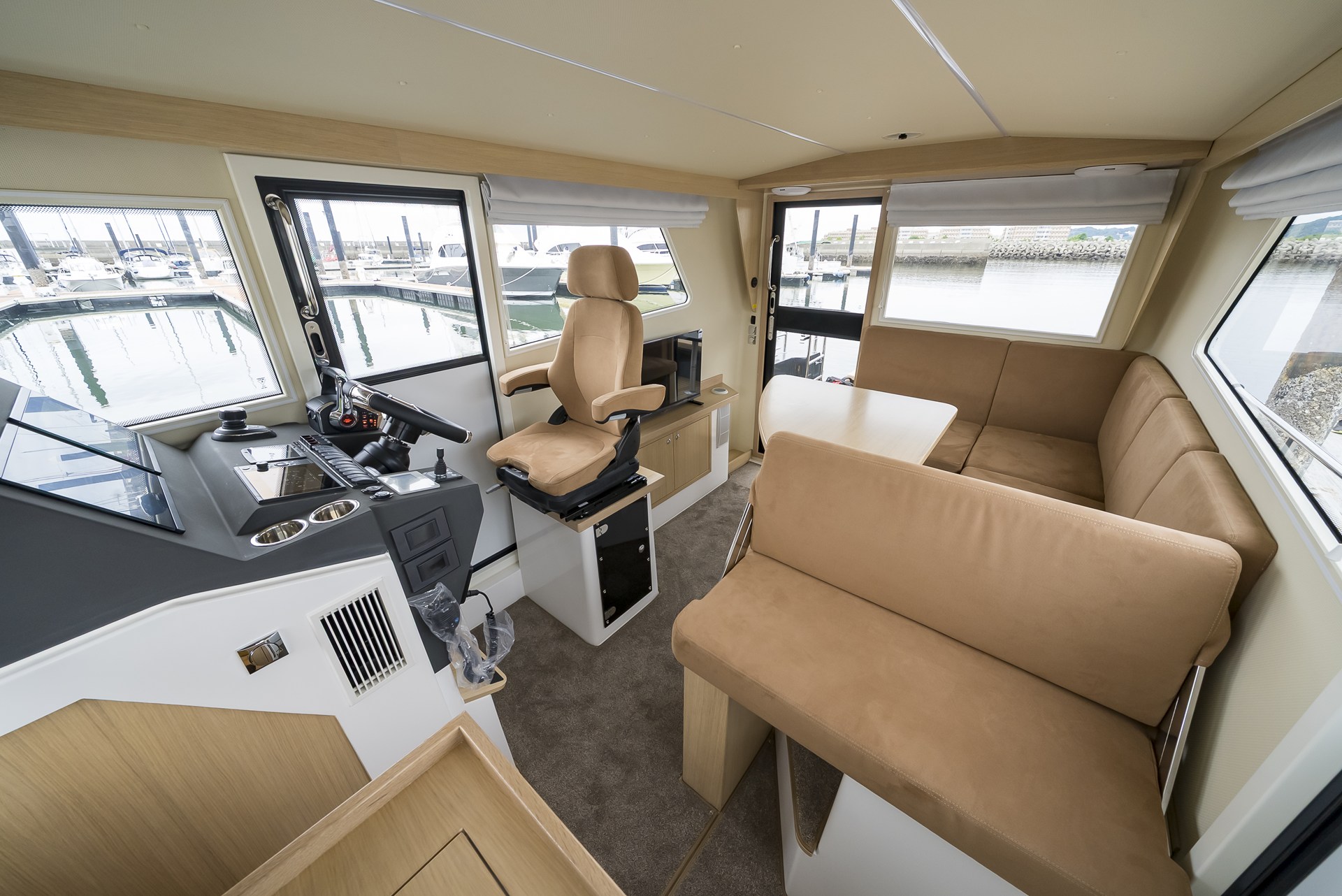 パイロットハウス内の全景。前方に操縦席(右舷側)と助手席(左舷側)、後方の左舷側にはL字型のソファというレイアウト