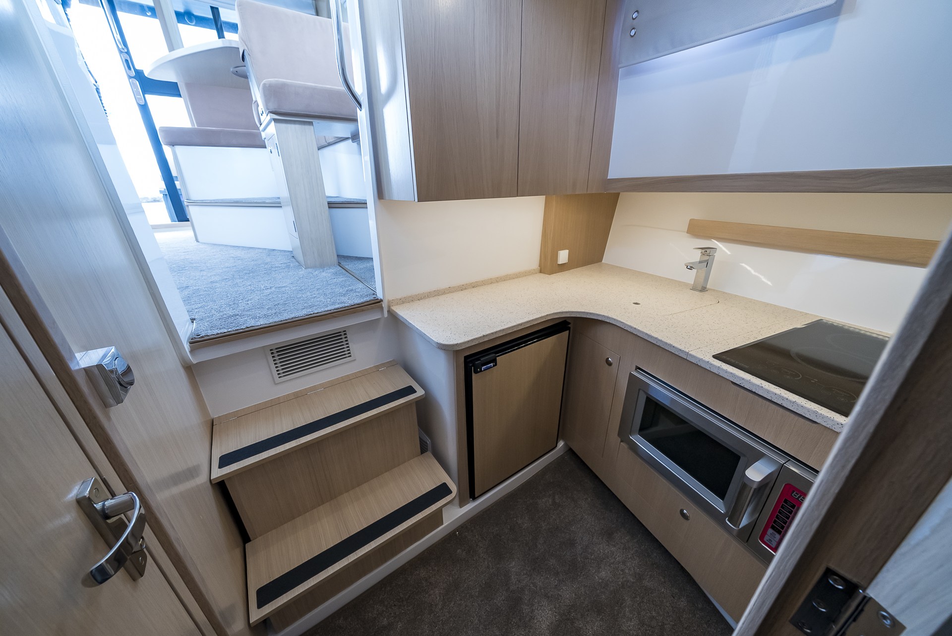 ハウス内を前方に進み、階段を下りると、ミジップにはギャレーが設けられている。とても使い勝手がよさそうなレイアウトだ