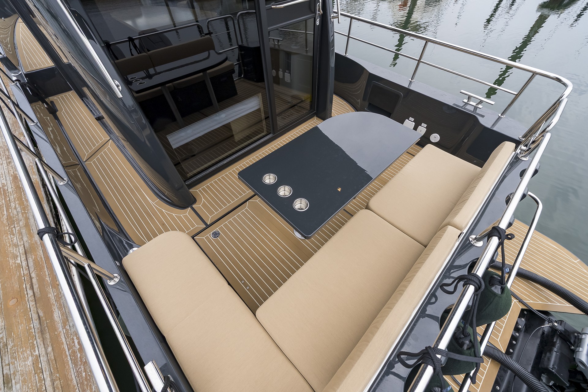 アフトコクピットは、後部にL字形ソファ、中央にテーブルという組み合わせ。上の写真では見えないが、アフトコクピット全体を覆う大きなイーブス(ひさし)を備えている