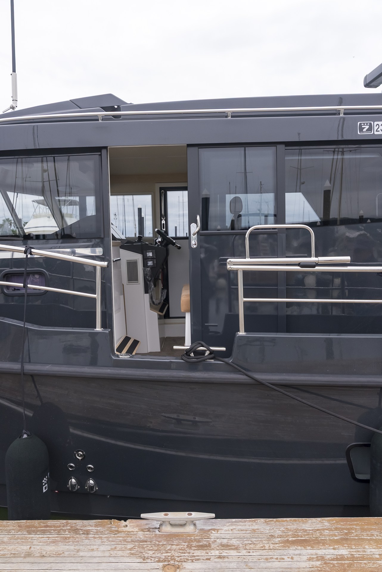 ハウスのサイドにはスライドドアが設けられており、外にはボーディングゲートもあるので、係船作業をするような場合にも船内からスムーズに動くことができるはず