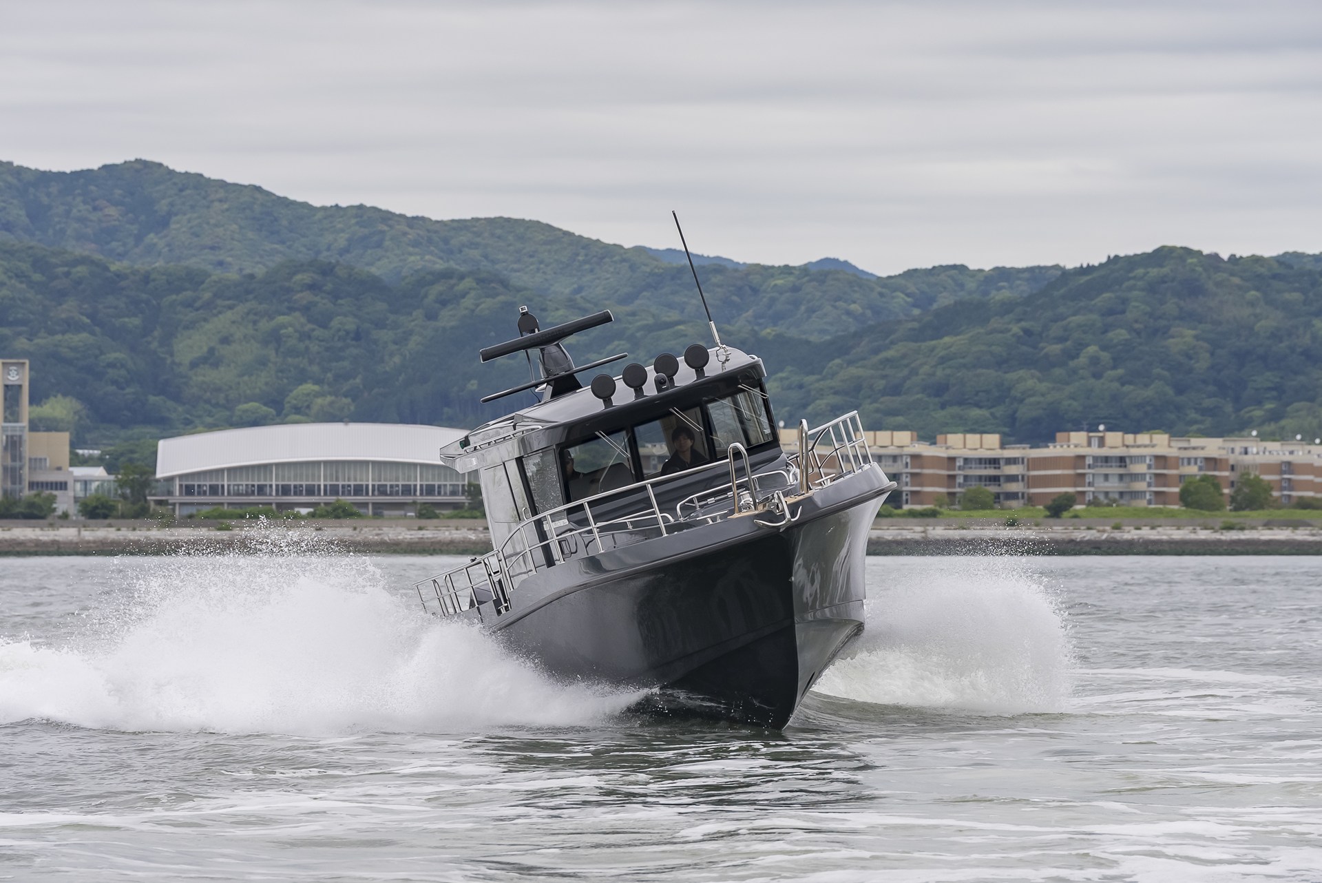 試乗艇は、マーキュリーのV10ベラード400馬力の2基掛け。試乗時の最高速度は42ノットオーバー。ほかに船内外機(スターンドライブ)仕様の選択も可能となっている