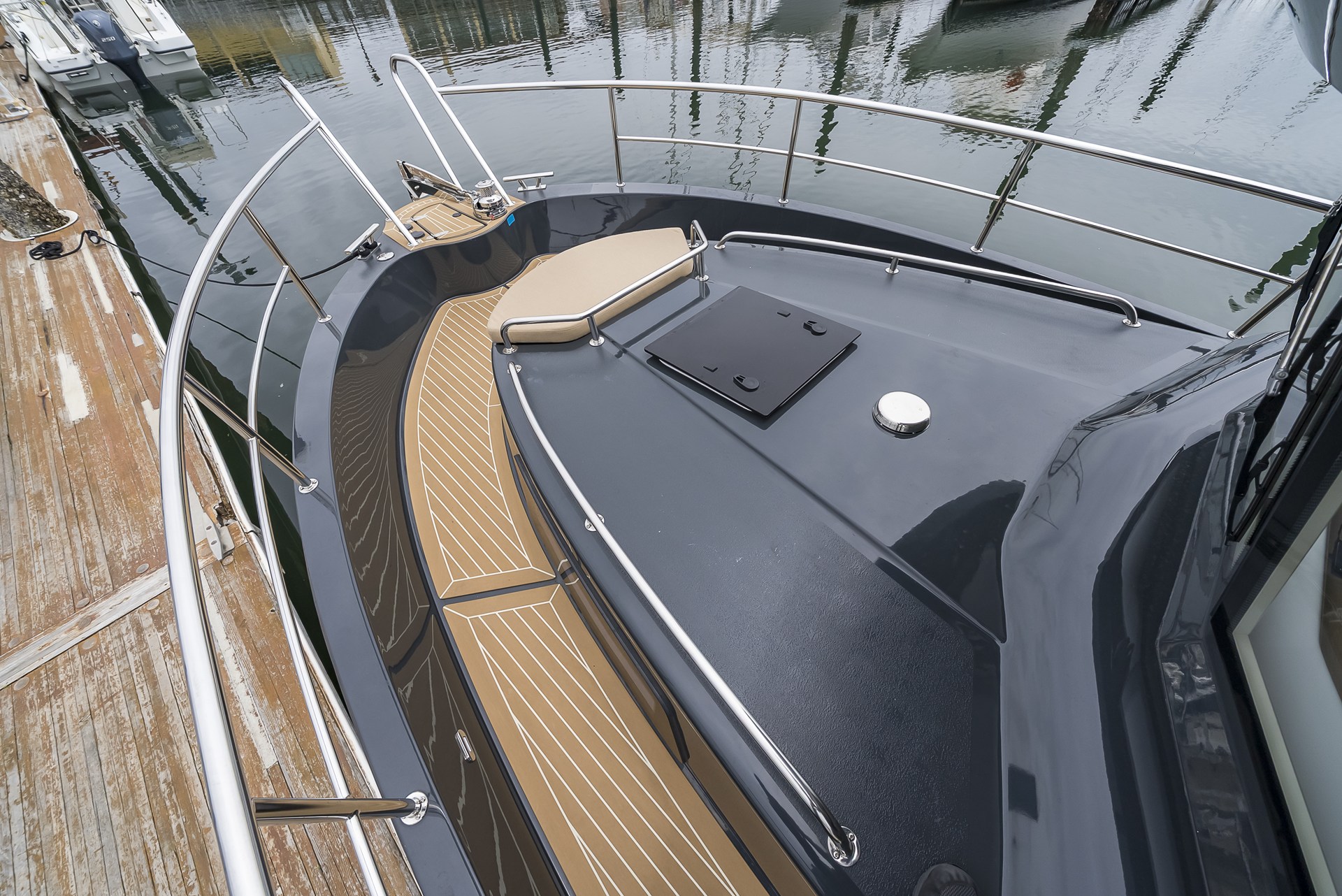 船体の周囲にめぐらされたレールの高さは十分にあり、移動の際にも安心感がある。フォアデッキのキャビントランク前方には、小さなシートが設けられていて、アンカー作業をするときなどには使い勝手がよさそうだ