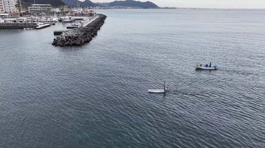 警戒船誘導のもとで出航・自律航行したUSV(小型水上ドローン船)「β機」。 鎌倉沖の試験海域にて、自律航行による海洋監視を実施した