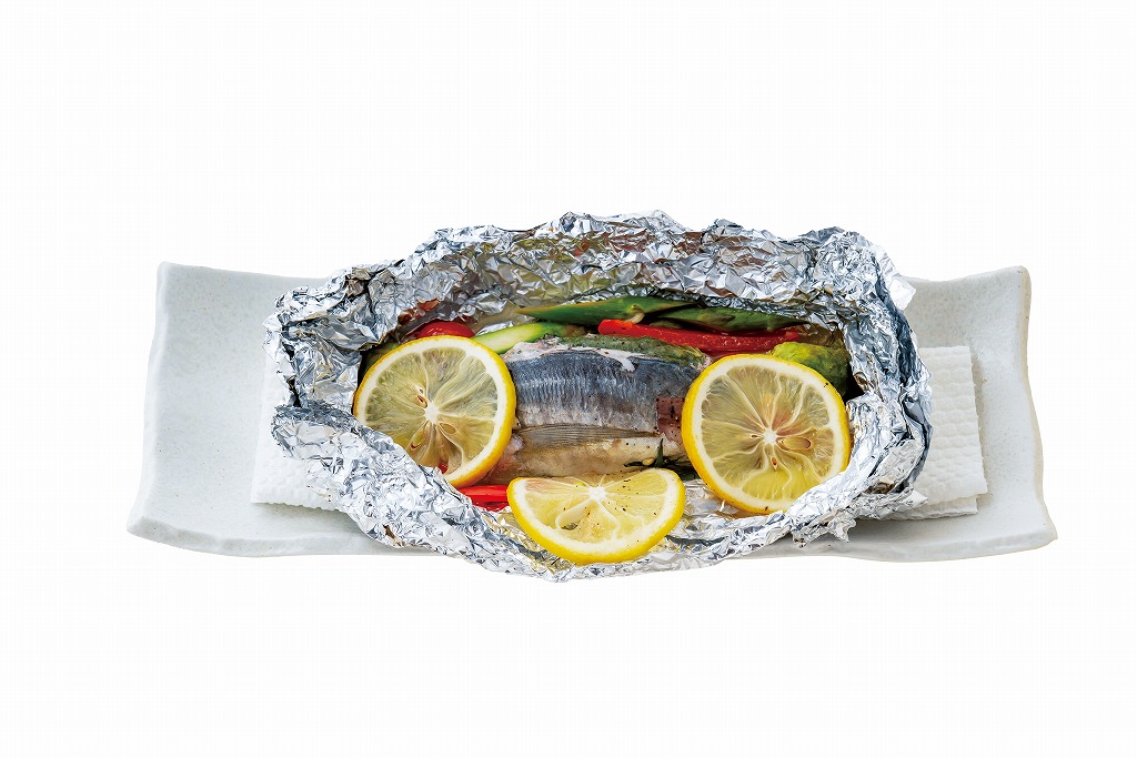 ホイル焼きは、素材すべての栄養素を流出させることなく摂取することができる優れた料理法だ。魚の背中側から中骨と内臓を抜くさばき方はいろいろな場面で使えるので、覚えておくとレパートリーが増える。アジなら、ウロコとゼイゴを取り、頭を残したまま背ビレ両側に後頭部から尻ビレ近くまで包丁を入れ、ハサミで中骨の両端と尻ビレ付け根を切って取り除き、内臓とエラも取る。