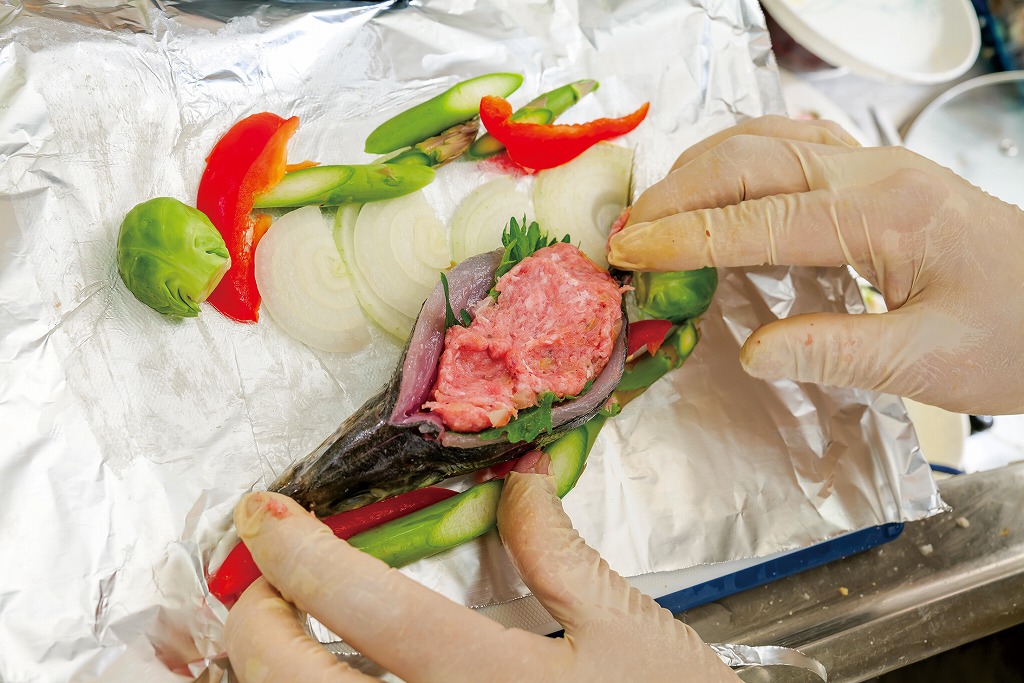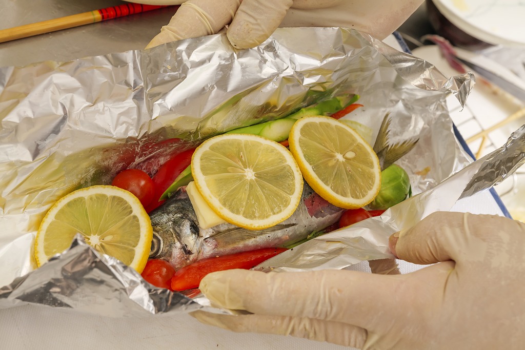 ②アジは背中から中骨と内臓を取り去り、その中に大葉と①のひき肉を詰め込む。アルミホイルにバターを塗り、タマネギの上にアジと野菜、レモンをのせ、アルミホイルを二重にして包む。フライパンに白ワインと一緒に入れて中火で15分。塩こしょうで味付け