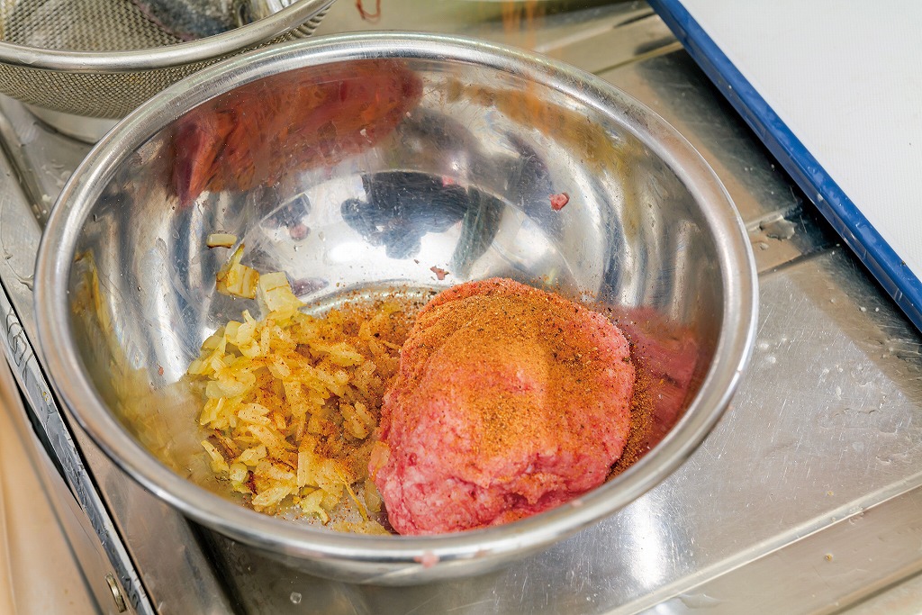 ①まず、豚ひき肉を粘りが出るまでよくこねる。タマネギ1/4をみじん切りにし、透明になるまで炒め冷ましておく。ひき肉とタマネギ、ナツメグ小さじ1、塩こしょうを混ぜ合わせて再度よくこねておく。タマネギの残りの1/4と野菜類をそれぞれカットしておく