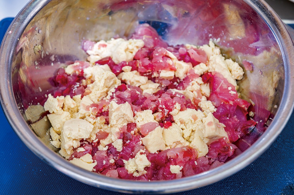 ③②のイナダの切り身をスライスしたあと包丁で細かくたたき、①の豆腐と交ぜる。それをポリ袋に入れ、かたくり粉大さじ1を加えてしっかりともみこむ。できれば、そのまま30分から1時間ほど冷蔵庫で寝かせておくと、なじんでそのあとの成形がしやすくなる