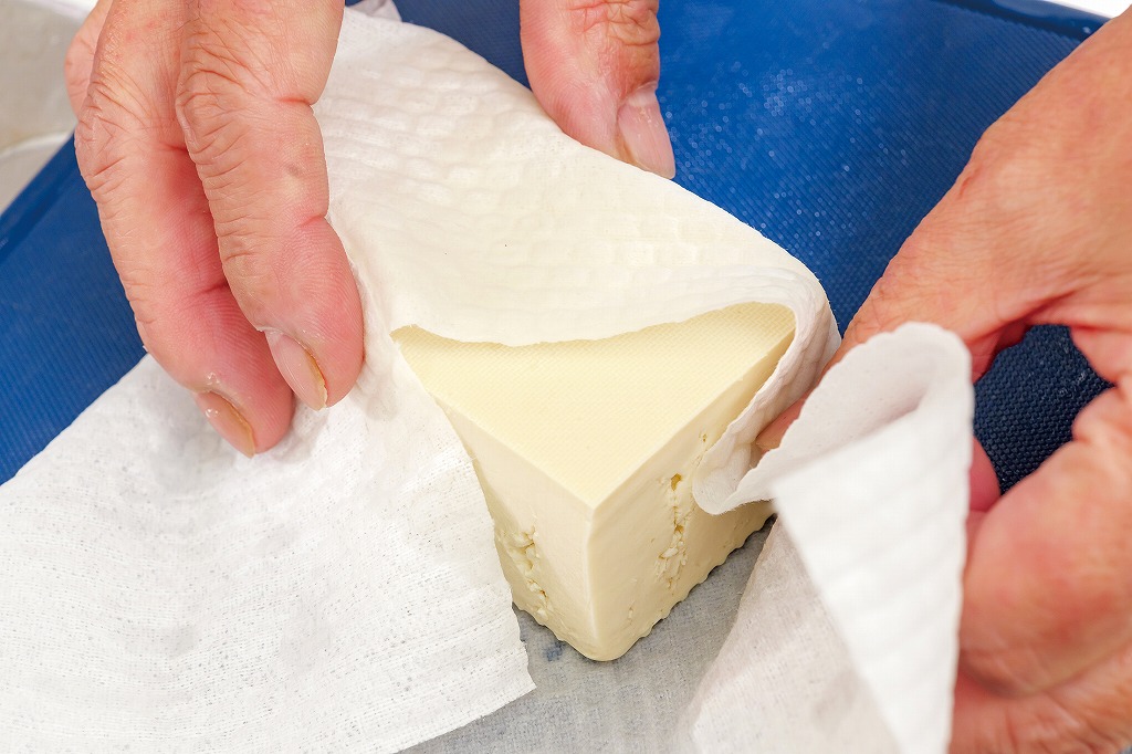 ①200グラムの木綿豆腐をキッチンペーパー2枚で包み電子レンジ500ワットで1分半加熱。さらに、ペーパーを取り換えて豆腐に重しをし、斜めにしたまな板などの上にしばらく置いておく。ちゃんと水抜きができれば、豆腐の重さがイナダの切り身と同じ180グラム程度になる