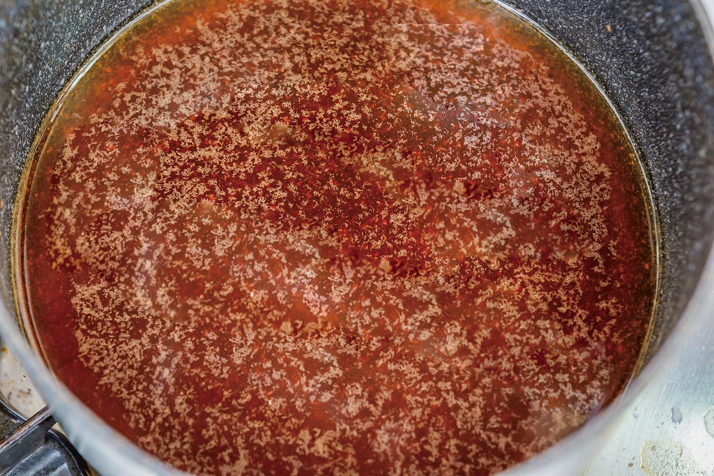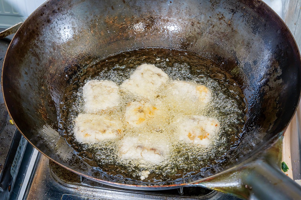 ⑥油温は170~180度。火の通りは早いが、中の水分まで飛ばすようにじっくり揚げないとカリッと仕上がらない。時間がたつと中から水分がにじみ出てきてふやけてしまう。箸で持ったときにチリチリしているうちはまだ水分がある。揚げ油の泡が細かくなったらOK
