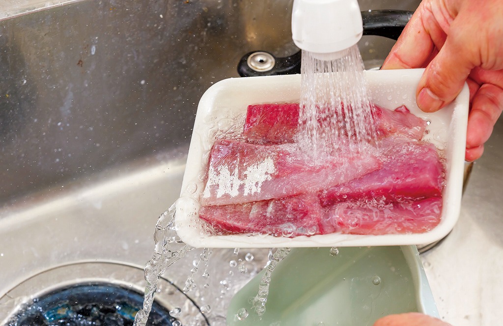 ②イナダは、三枚におろしてから皮とすべての骨と血合い肉を取る。切り身の全体に薄く塩を振り、表面に水分が浮いてくるまで30分以上放置しておき下味を付ける。そのあと、水洗いをすれば、塩と一緒に臭みを洗い流せる。あとは、水分を軽く拭き取っておく