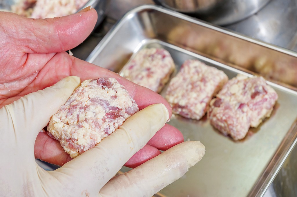 ⑤③をひと口大に成形する。丸でも三角でも俵形でも好きな形に整えたら、かたくり粉を全面にまんべんなくまぶし、ポンポンとはたくようにして余分な粉を落とす。粉を付けたらすぐに揚げるのがこの料理最大のコツ。時間をおくと揚げている途中で崩れてしまう