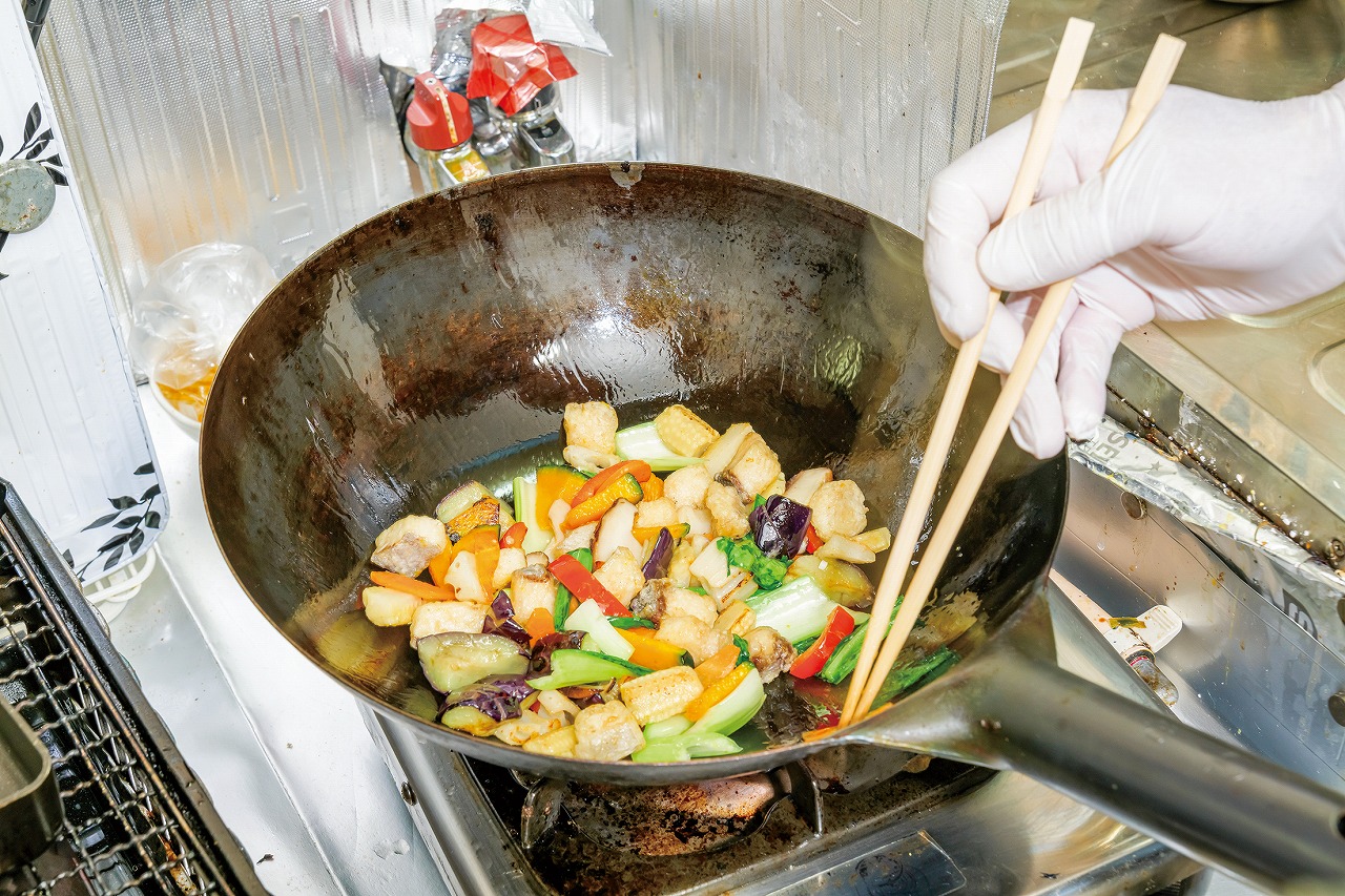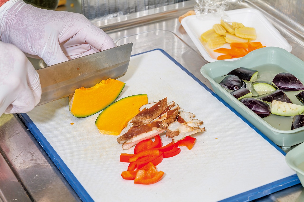 ②カボチャはスライス2枚を2~3等分に切る。ナスは大きめのひと口大に切り、皮へ切れ目を入れておく。レンコンは皮をむいて乱切りにし、ナスとレンコンは水にさらしておく。シイタケとニンジンはスライスし、チンゲン菜、ベビーコーン、パプリカはざく切り