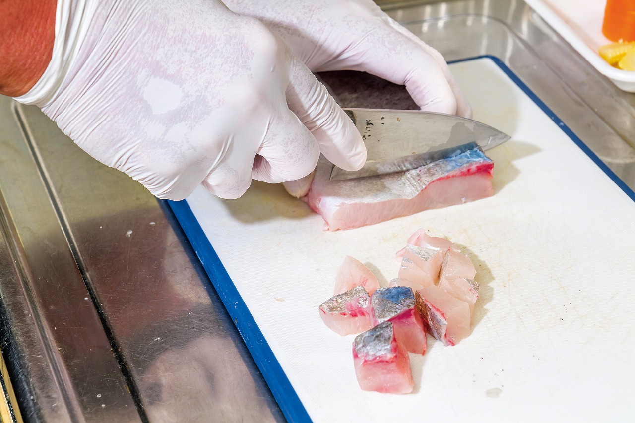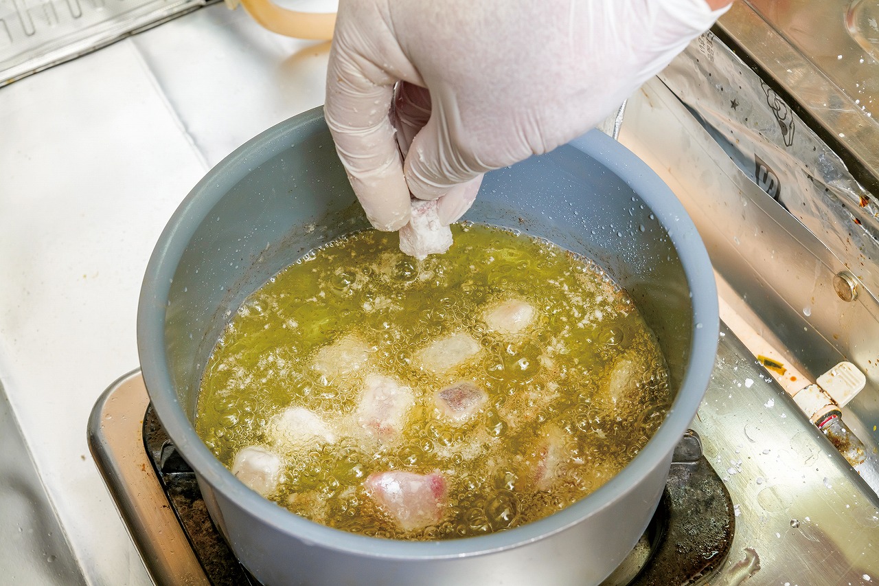 ①カンパチは頭と内臓を取り、三枚もしくは五枚におろしたら、腹骨と血合い骨を取り、腹身を100グラムほど使う。皮をひいて大きめのサイコロ状にカットし、3~5%の塩水に数分間漬け込んでおく。その後、水分を拭き取り、こしょうを振りかけ小麦粉をまぶしておく