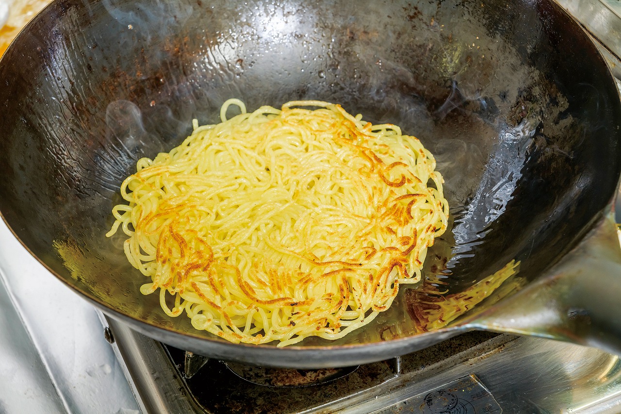 ⑤まず、焼きそばの麺を袋のまま、電子レンジ500ワットで40~50秒加熱すると麺がほぐれやすくなる。それから多めの油を入れたフライパンで炒めて両面がパリパリになるまで焦げ目をつける。中華麺を使う場合は、指定時間ゆでてから水洗いをし、水気を切ってから炒める
