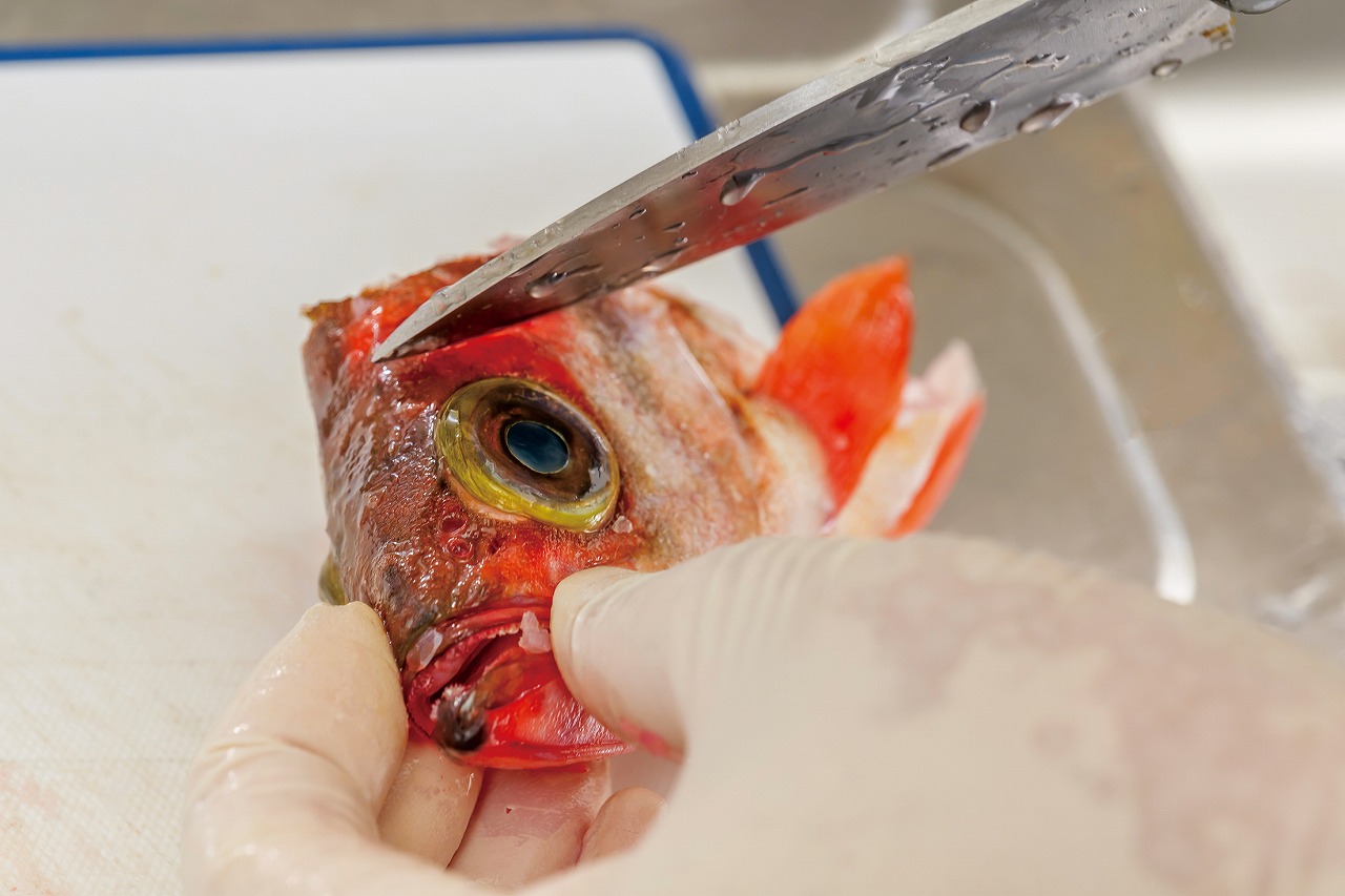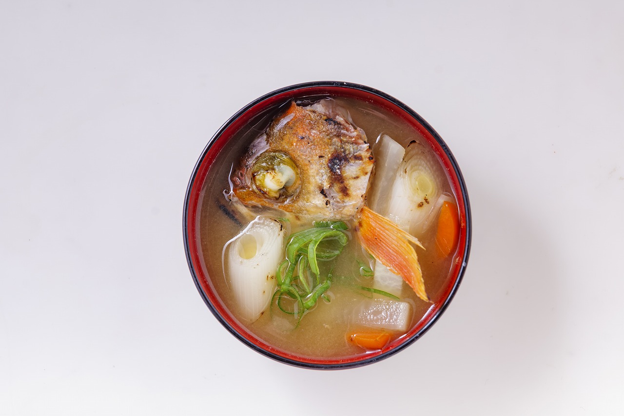 せっかく定食屋らしく丼物を作ったのでついでにみそ汁も作ろう。それなら、せっかくなのであら汁にしようと思い、残ったトゴットメバルの頭を使いチャチャッと作ることにした。前日からあらでだしを取る方法もあるけれど、半日勝負の撮影では間に合わない。できればド〜ンと頭を入れてインパクトを付けたい。ところが、よくよく考えたらあら汁って、簡単に作ろうとしてもなんだかんだと、メインのアクアパッツァよりも手間がかかるんです。霜降りをして掃除をしたあと、さらに焼き霜にしたり。まぁ、しかたないナ。