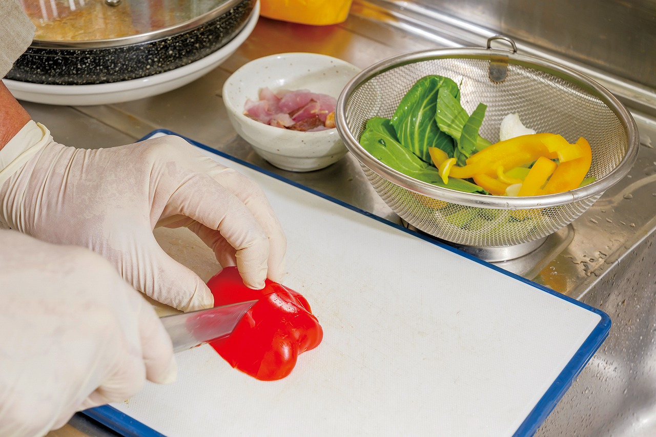 ①三枚におろしたトゴットメバル(半身)の腹骨と血合い骨を取り、皮を残したまま縦に15ミリくらいの幅で短冊切りにする。切り身をポリ袋に入れ、鶏ガラスープ大さじ1と酒小さじ1を入れて軽くもみ、小麦粉 大さじ2を入れてまぶす。パプリカとチンゲンサイも短冊切り