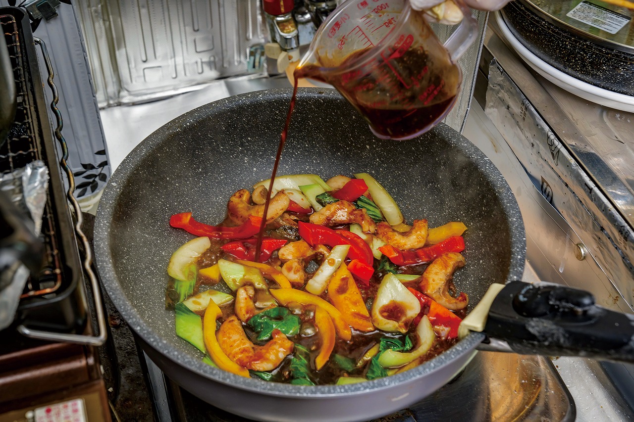 ②フライパンにごま油を入れ、まずはトゴットメバルの切り身を炒める。切り身がカリッと焼けたら野菜類を入れて軽く火を通す。そしてたれを回し入れて味をなじませたら、丼ご飯の上に盛り付け、みじん切りにして水にさらしておいた長ネギをのせて完成