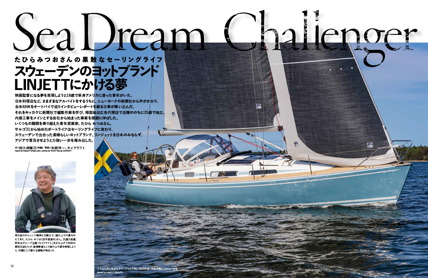今秋、日本に初上陸するスウェーデンのヨットブランド「LINJETT(リンジェット)」を輸入する青年実業家、たひらみつおさんの果敢なセーリングライフと共に、そのリンジェットのヨットの魅力を解説。次号(42号)ではLINJETTを育んだスウェーデンのセーリング文化、歴史を特集する。