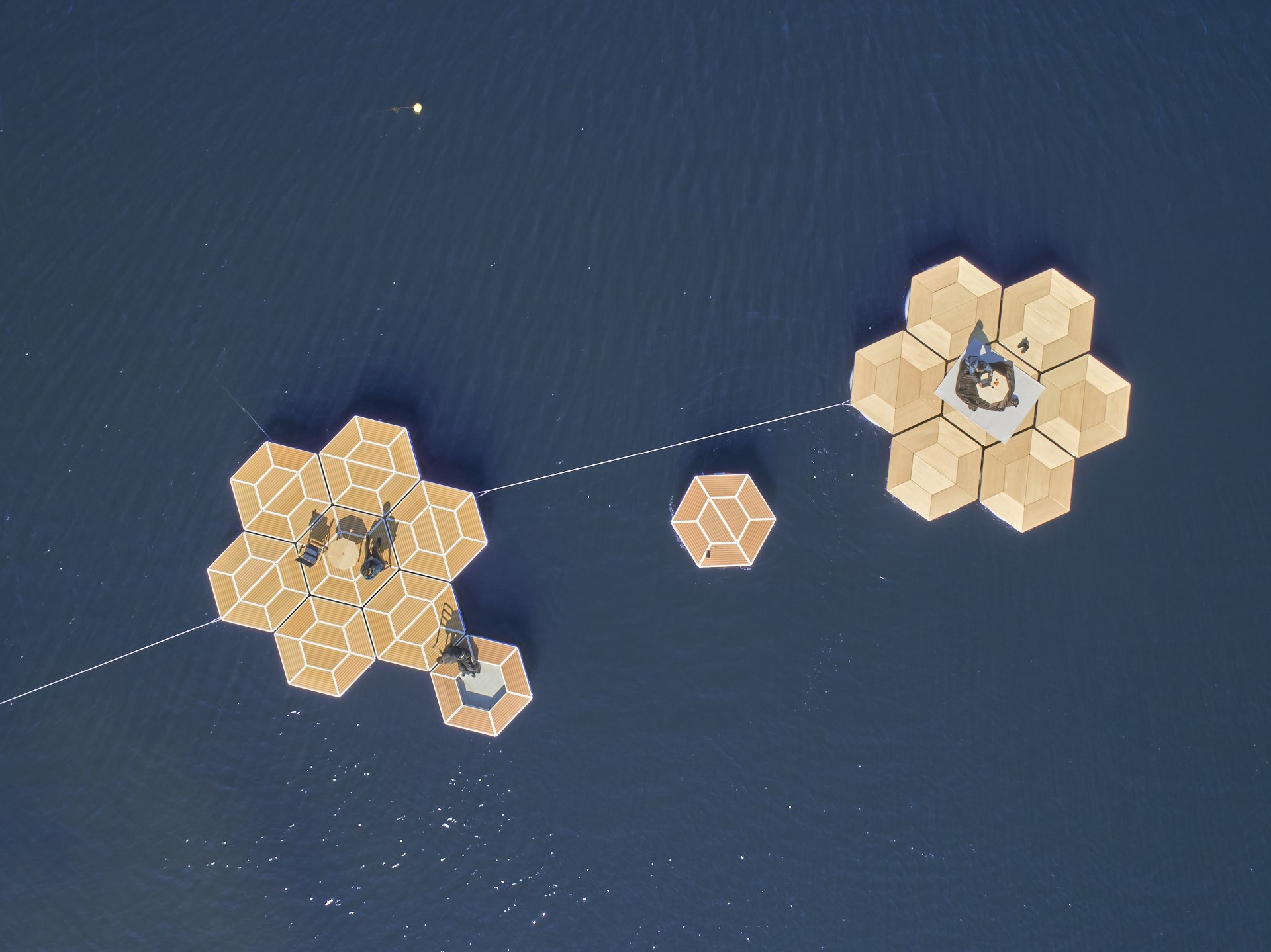 Sixフロートは、円形のRIBボートの上にFRP(繊維強化プラスチック)を平らな座面として配した構造。幅3メートル弱の大きさで、大人でも大の字になって寝られるサイズがある。六角形の単体のSixフロートを連結し、面積を拡張して使うこともできる。