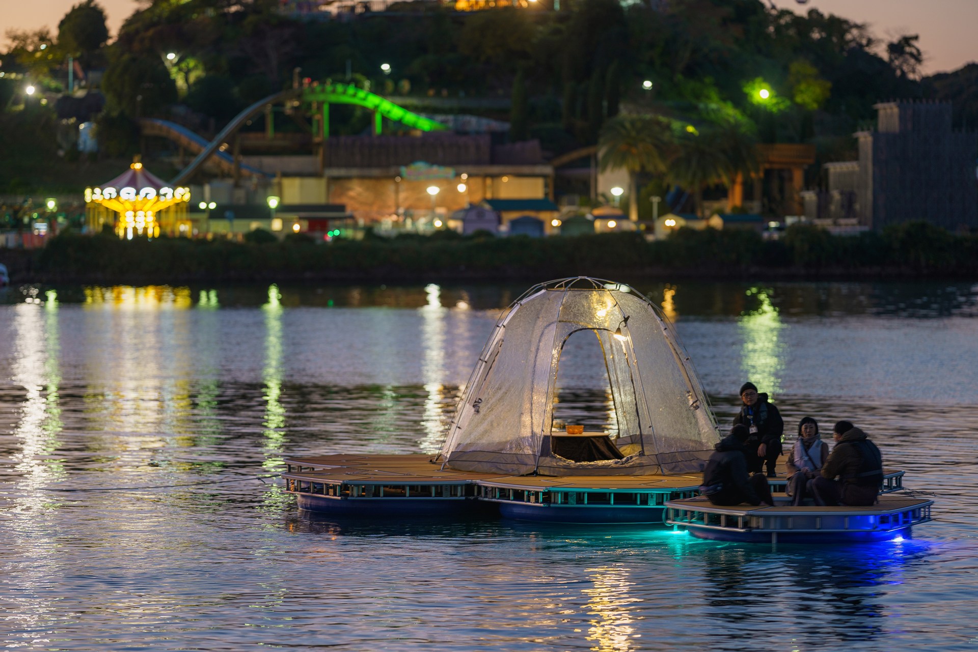 「湖上であおむけになりながら星空も見てみたい」──各地の地域イベントでSixフロートが活用された際、来場者の方々から、その用途についてさまざまなアイデアが出たとのこと。タイトルカットの写真は、昨年11月に浜名湖で行われたイベント「湖上こたつフロート」での活用例。夏のイベントだけでなく、冬にはSixフロートの上にこたつを置いて、のんびりくつろぐことを目的にしたイベントも行われた。