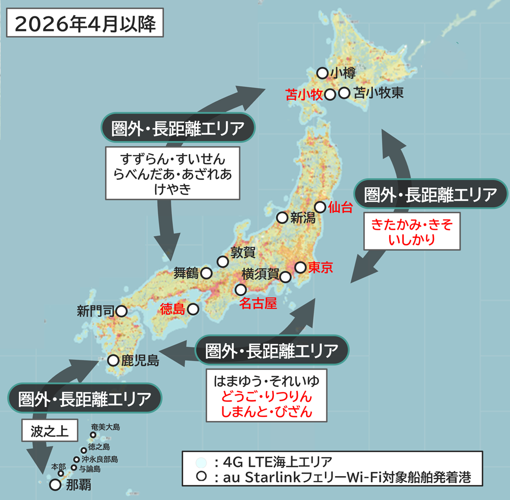 加えて、この2社より1年早く同サービスを開始していたKDDIは、この4月より「au Starlink フェリーWi-Fi」の導入船舶を、新たに7隻、順次拡大していく。