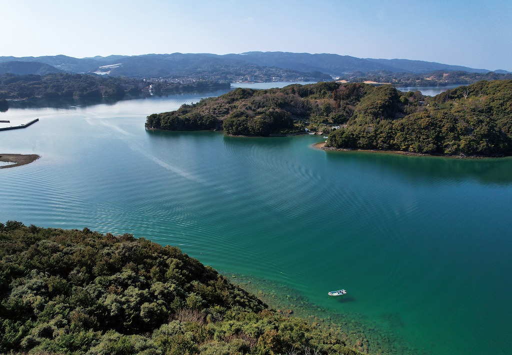 大村湾の南、時津町にある前島の間の水路をドローンで撮影。小さな和船が航行したあとには、海面にきれいな波紋が現れた