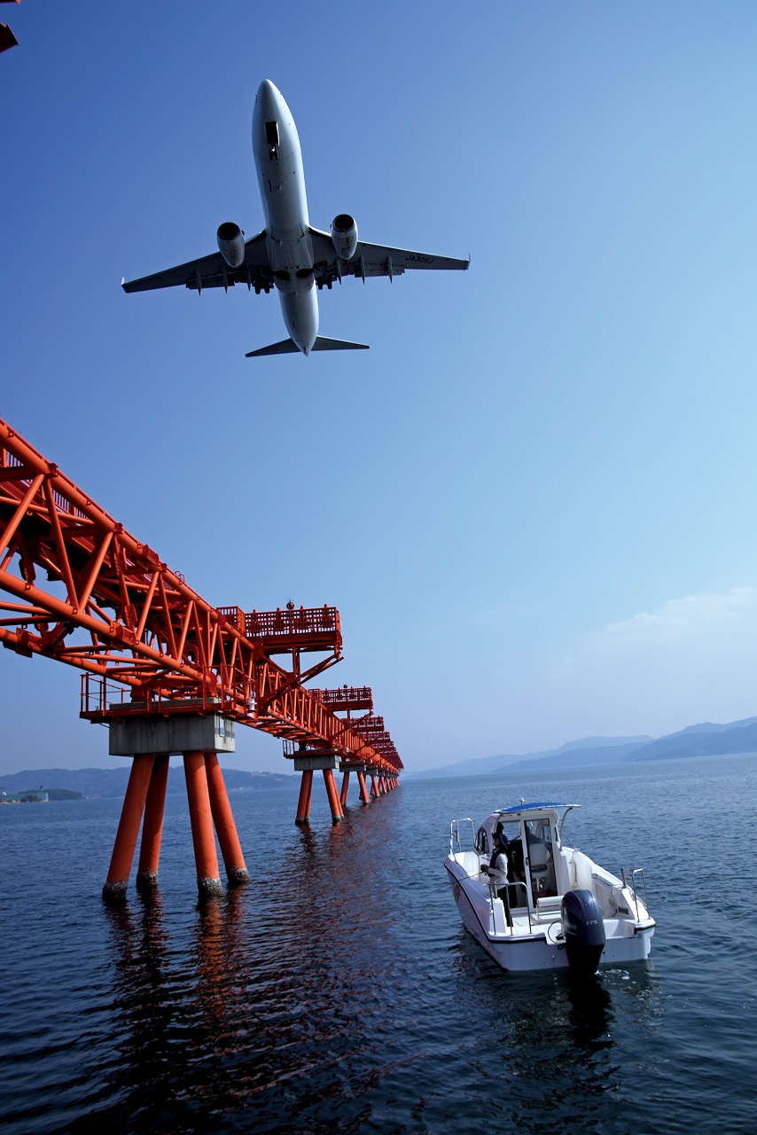 こちらもまた赤が利いた風景。長崎空港の滑走路誘導灯近くでは、真上を通過する飛行機を見ることができる。空港に近い位置まで航行できるため、ほかの空港と比べても機体が大きく感じられた