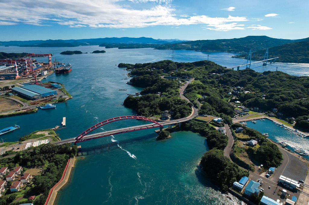 左奥に見えているのが大島造船所。赤いアーチ型の鉄橋は、寺島へとつながる寺島大橋。右奥の白い斜長橋が、西彼杵半島(九州本土)との架け橋である大島大橋。寺島大橋の下は、潮の流れが速いため、白い渦の跡が航跡のように見えている