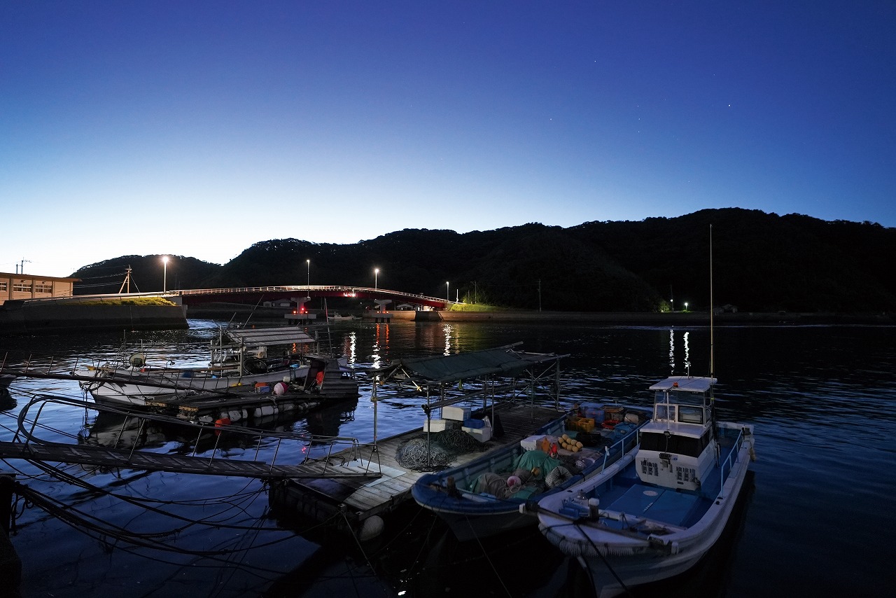 日が昇る1時間前、崎戸島の小さな船だまりで。上空が紺色から青へと変化する中、崎戸島と蛎浦島(かきのうらしま)を結ぶ本郷橋の明かりが点々と光る