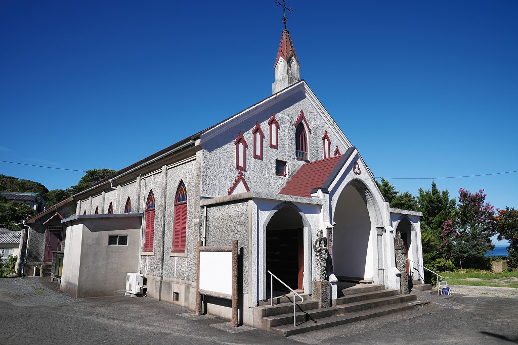 大島の太田尾地区にあるカトリック教会「太田尾教会」。木造モルタル仕上げの教会堂は昭和4年(1929年)に造られた。入り口には2体の石像。内部はコウモリが羽を広げたようなリブ・ヴォールト天井が特徴的。事前に確認連絡をすれば見学も可能