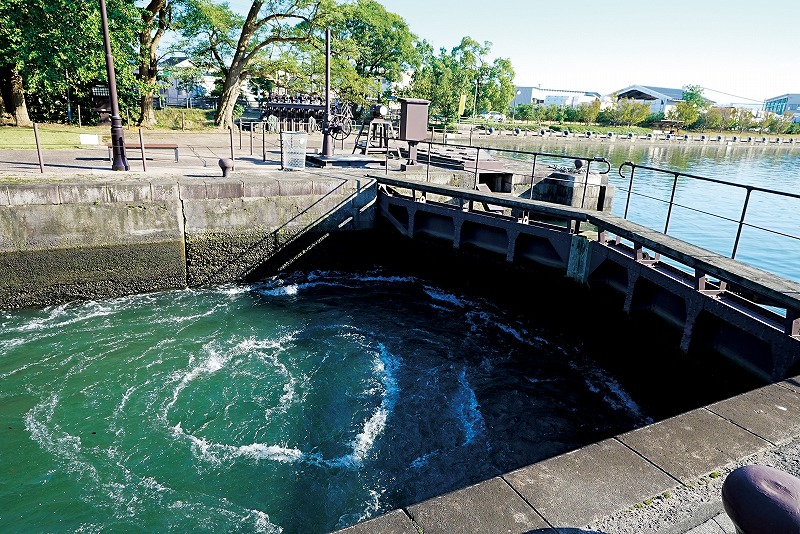 閘室の扉が閉まるときに大きな渦ができていた。運河クルーズでは、約2.5メートルの水位差を調整する“水のエレベーター”を体感することができる