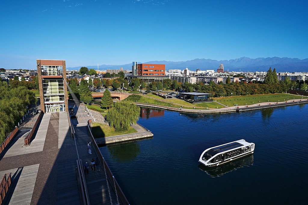 運河クルーズ出発地点である富岩運河環水公園。公園のシンボルかつ展望台でもある天門橋から撮影。公園全体だけでなく立山連峰も一望できる