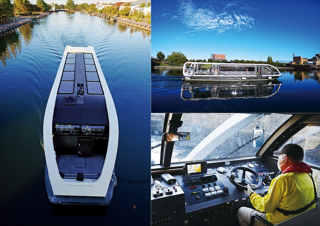 2015 年3月から就航しているクルーズ船〈fugan〉(右上)。屋根にソーラーパネル(左)を装備した、モ ダンで先進的なデザインが特徴的。船体のアルミの風合いと、操船席(右下)の前の美しい曲げガラスが特徴的だ。定員は55 人