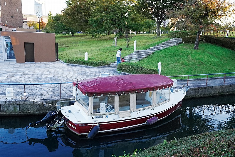 運河クルーズの初代ボート、〈もみじ〉。赤い屋根と船体がかわいい定員11名のコンパクトサイズの電動ボート。今も現役で活躍している