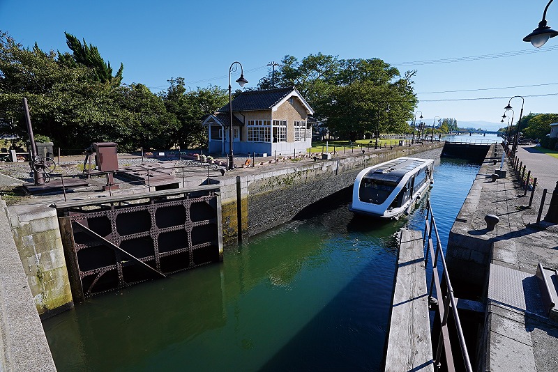 途中にあるパナマ運河方式の中島閘門や、緑の多い環水公園に整備された運河沿いの道など、見どころの多い場所となっている。