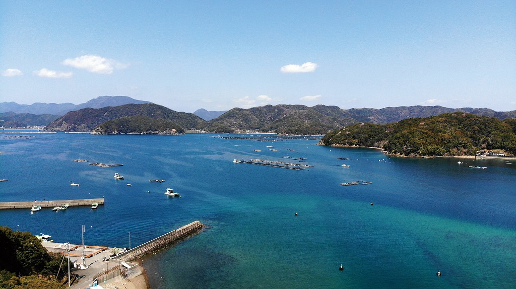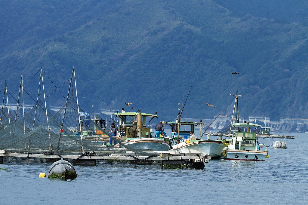 そんな海面の利点を生かして、湾内ではマダイやブリ、カンパチなどの養殖業が盛んに行われている。