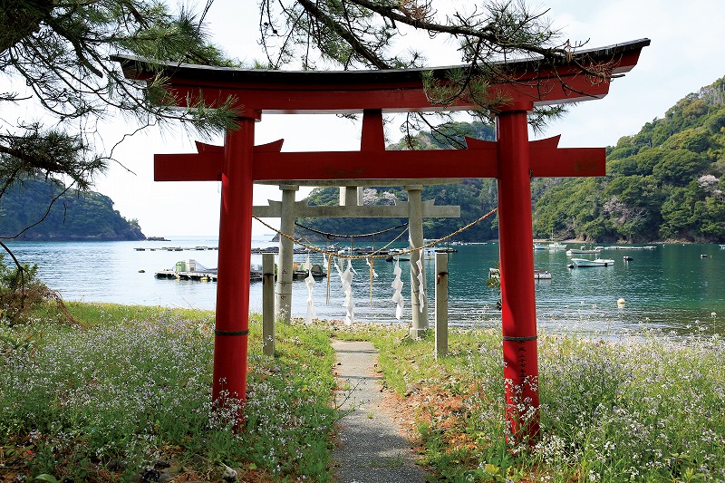 須崎市の南部、中ノ島の西に浮かぶ戸島。浜辺から続く鳥居は、交通の神様が祭られている戸島神社のもの
