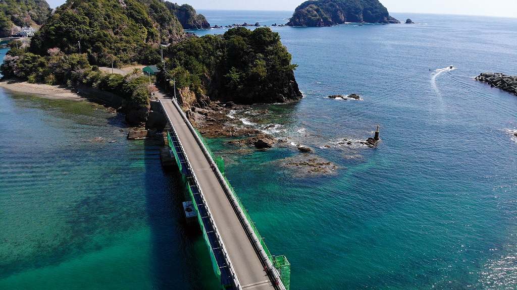 野見湾の南端にある中ノ島側から、太平洋と中ノ島大橋をドローンで撮影。中央奥に見えているのは無人島の神島。橋をくぐり抜け、大海原へと出かけていく漁船の姿が見えた