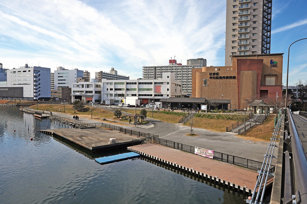 小名木川の東端、旧中川との合流地点には旧中川・川の駅。桟橋やスロープがあり、水陸両用バスも発着する。近くの中川船番所資料館では、番所があった江戸時代当時の様子が再現されている