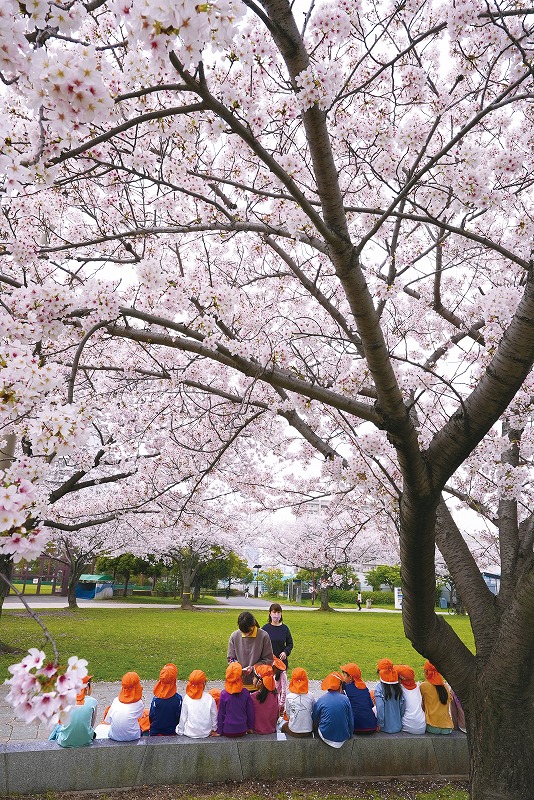 ひときわ大きな桜の木の下で、小さな子どもたちが一列に並んで座っていた。満開の桜の花が屋根となり、彼らを見守っているかのようにも見えた