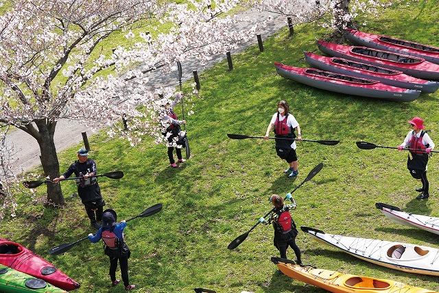 常に穏やかな水面で定評のある旧中川では、カヤック体験ツアーも開催されている。進水前、桜の下でパドルの使い方をレッスンする参加者の姿があった