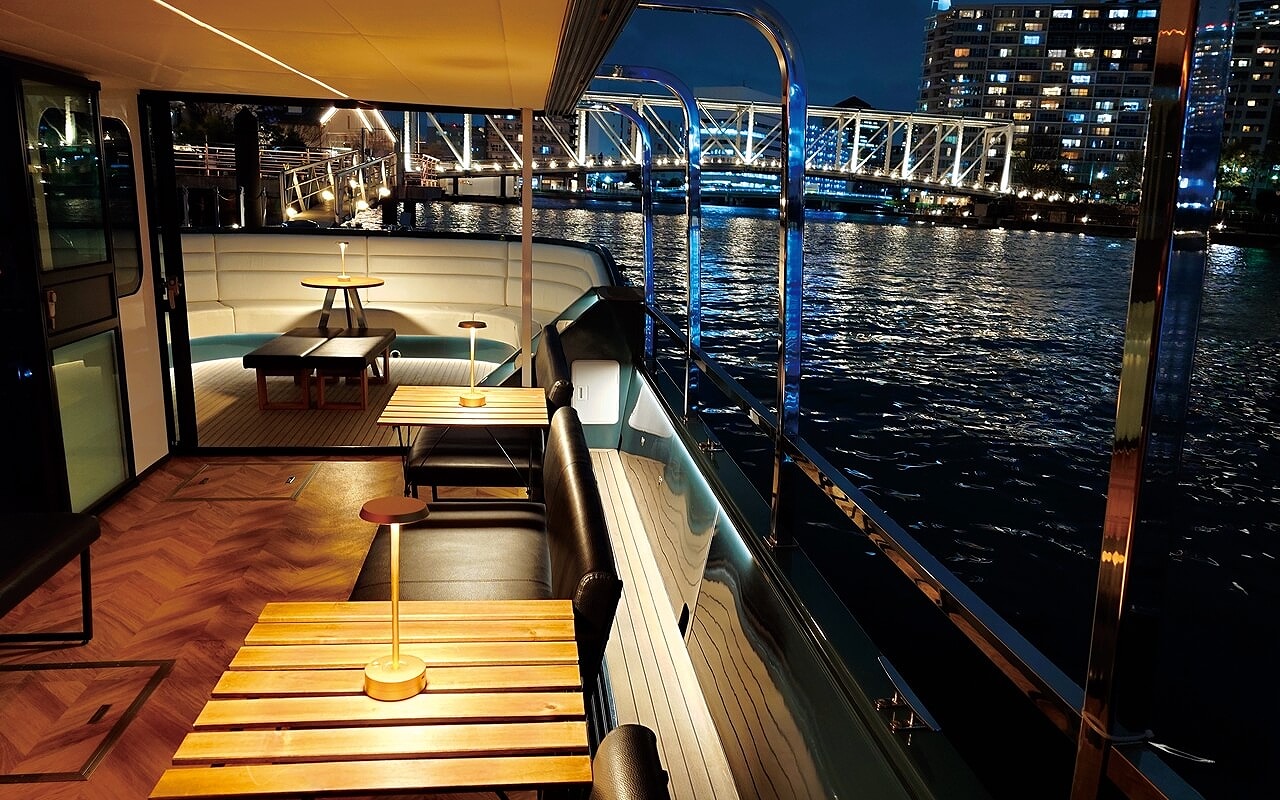バー・スタイルとは何か。同社によると、水面を航行する船でありながらも、お酒を楽しむバーのような雰囲気を味わえる船の設計スタイルのことだ。屋根がありながらも開放感あふれるレイアウトやムードを演出する間接照明や、オープンテラス仕様になっているデッキ、座り心地の良いソファなど、細部までこだわり抜かれた設計になっている。