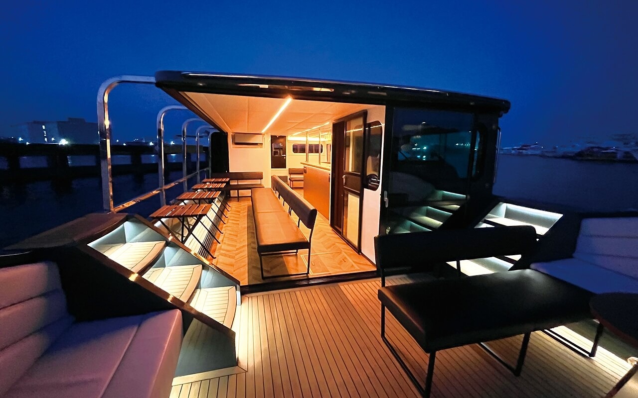 バー・スタイルとは何か。同社によると、水面を航行する船でありながらも、お酒を楽しむバーのような雰囲気を味わえる船の設計スタイルのことだ。屋根がありながらも開放感あふれるレイアウトやムードを演出する間接照明や、オープンテラス仕様になっているデッキ、座り心地の良いソファなど、細部までこだわり抜かれた設計になっている。