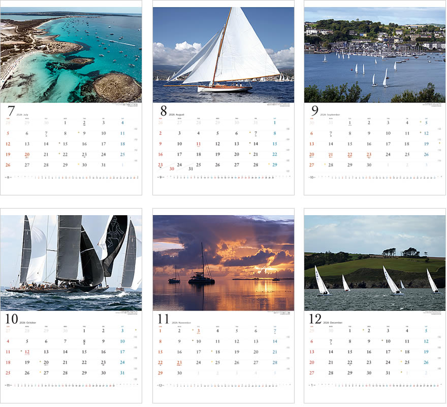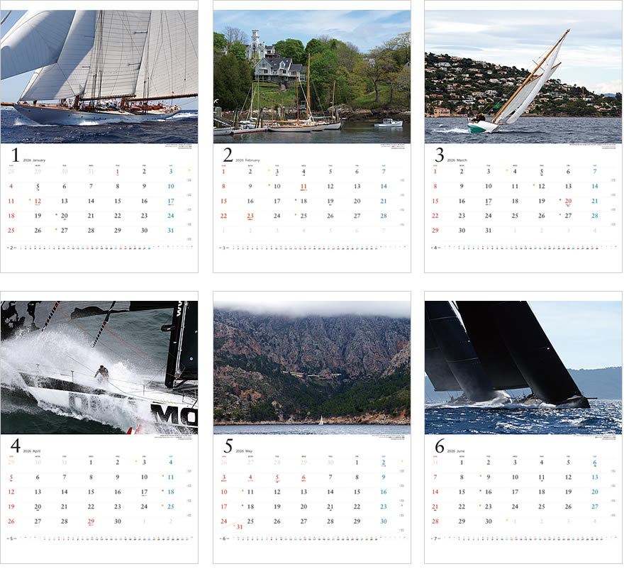 クラシカルなヨットからフォイリングするIMOCA60まで、さまざまなセールボートが毎月の暦を彩ります