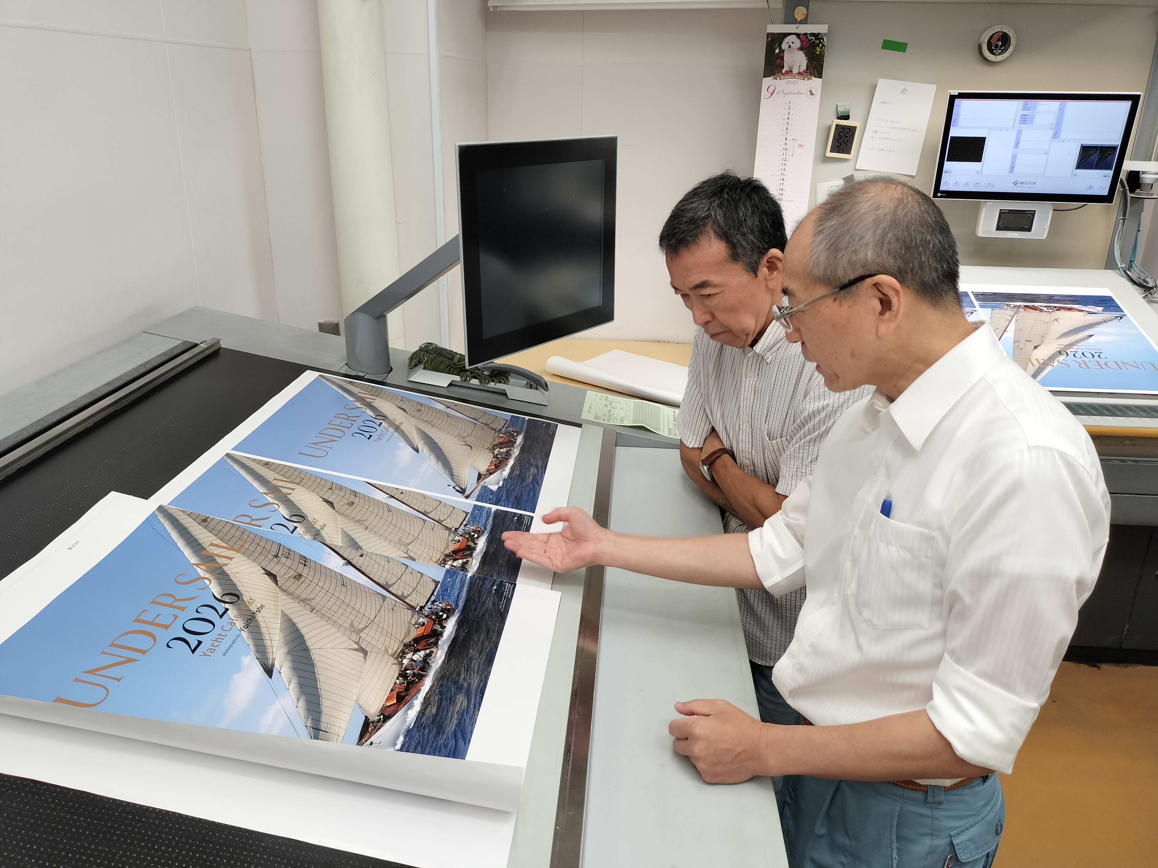 カレンダーを印刷した平河工業社で刷り上がりを確認する矢部洋一さん(奥)。手前は同社でプリンティングディレクターを務める“網点の魔術師”桐原淑郎さん