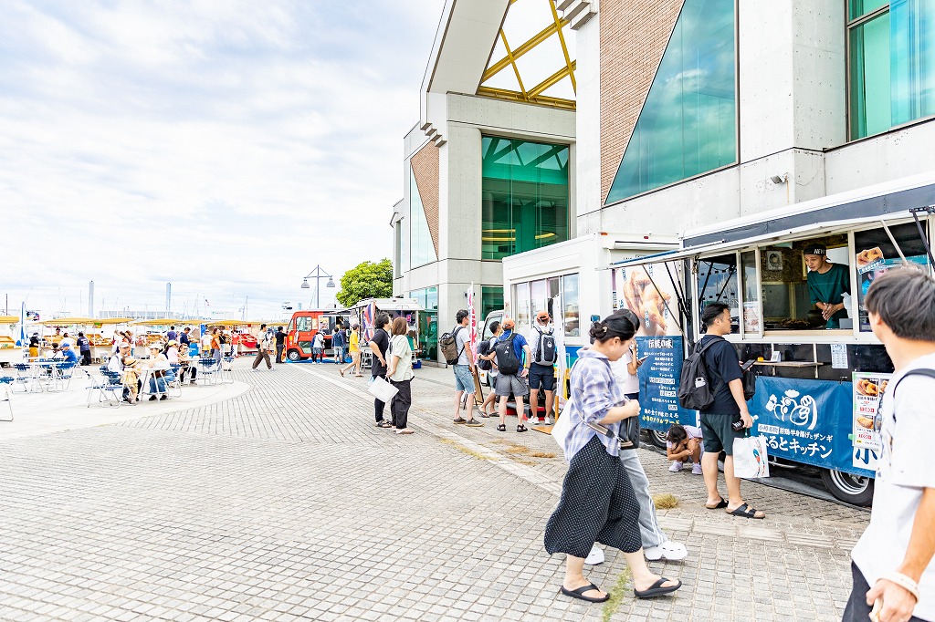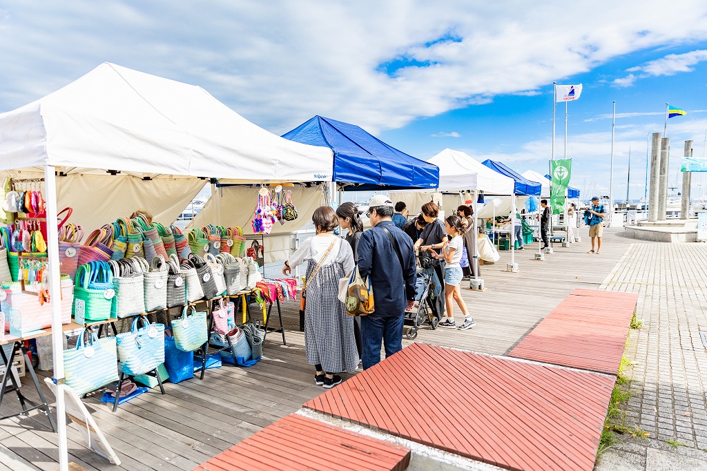 横浜ベイサイドマリーナ恒例イベント「Y.B.マリーナマルシェ」は、海辺の賑わい創出と地産地消をテーマに、開催するマーケットで、横浜市金沢区を中心に、地元の生産者や企業が主体となって、さまざまな商品をそれぞれのテントに陳列して出展。その他、キッチンカーも出店し、子どもからから大人まで楽しめるイベント。