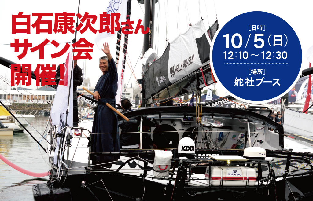 最終日の5日(日)12時10〜30分の間、舵社ブースにてDMG MORIセーリングチームのスキッパーである白石康次郎さんのサイン会を実施します。先着20名の方は、白石さんのA2ポスター(2025年『Kazi』1月号付録)にサインをいただけます。舵社ブースでお買い求めいただいた『Kazi』にサインをいただくことも可能です。